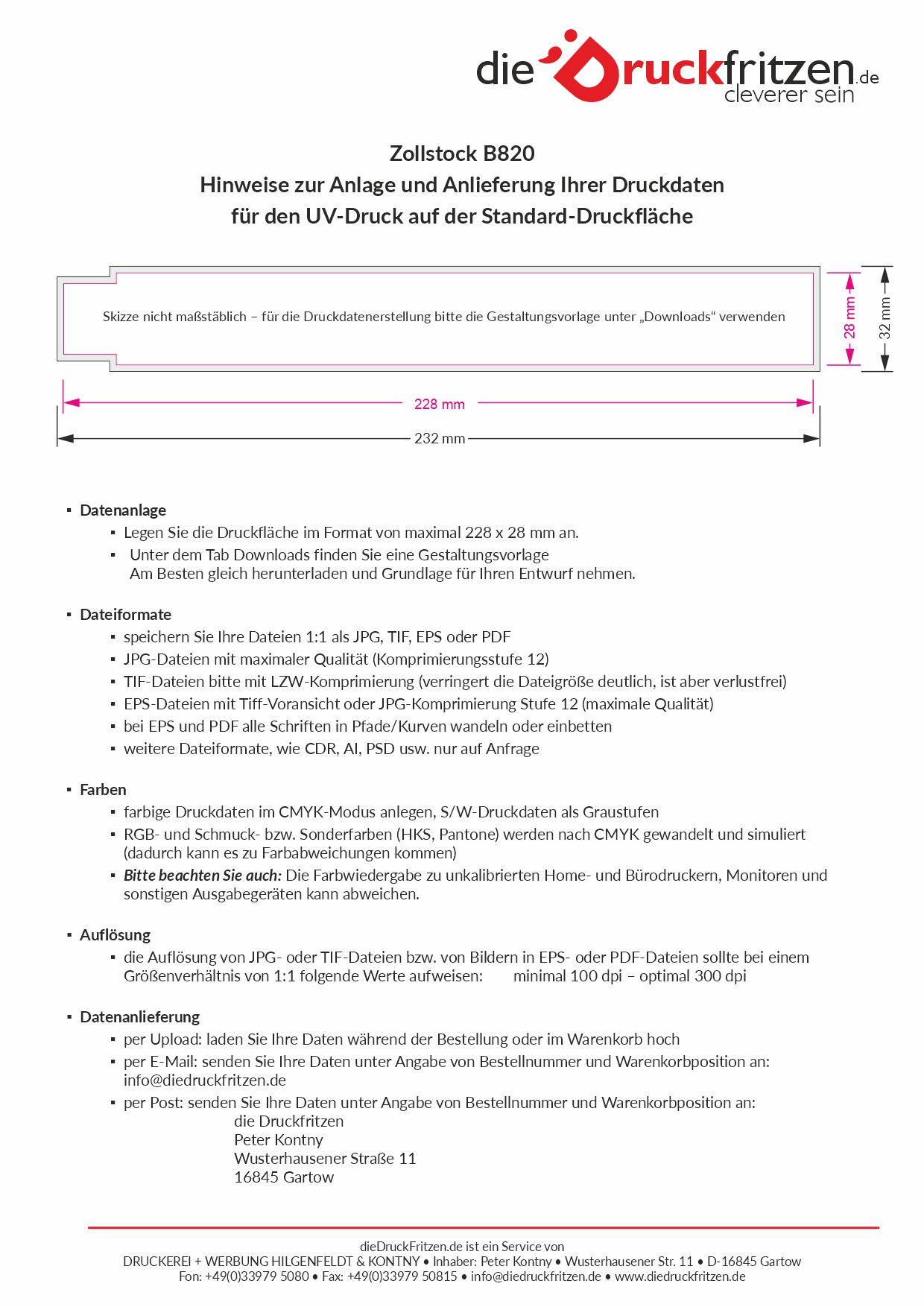 Die Bedruckung von Zollstöcken ist in der Haupsachen für Werbezwecke gedacht. Durch normalen Arbeitseinsatz kann es am Werbeaufdruck zu mehr oder weniger Abrieb oder Verschleiß kommen. Außerdem kann es zwischen den Gliedern, durch den digitalen UV-Direktdruck, zu leichten Sprühnebelspuren des Druckbildes kommen. Das alles stellt keinen Reklamationsgrund dar. Bitte beachten Sie auch die Hinweis unter "Druckdaten".