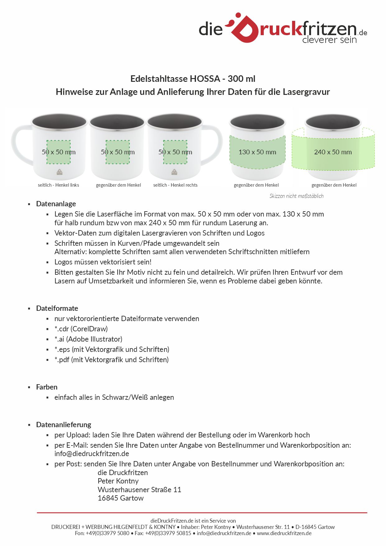 Die Tasse HOSSA besteht aus recyceltem Edelstahl und hat ein Fassungsvermögen von 300 ml. Die Edelstahltasse ist einwandig und in verschiedenen Farben erhältlich.Sie wurde speziell für die Lasergravur entwickelt. Beim Lasern wird die Farbe abgetragen und das darunter liegende Metall erscheint. Die Tasse HOSSA wird einzeln verpackt in einer Kraftpapier-Box geliefert.