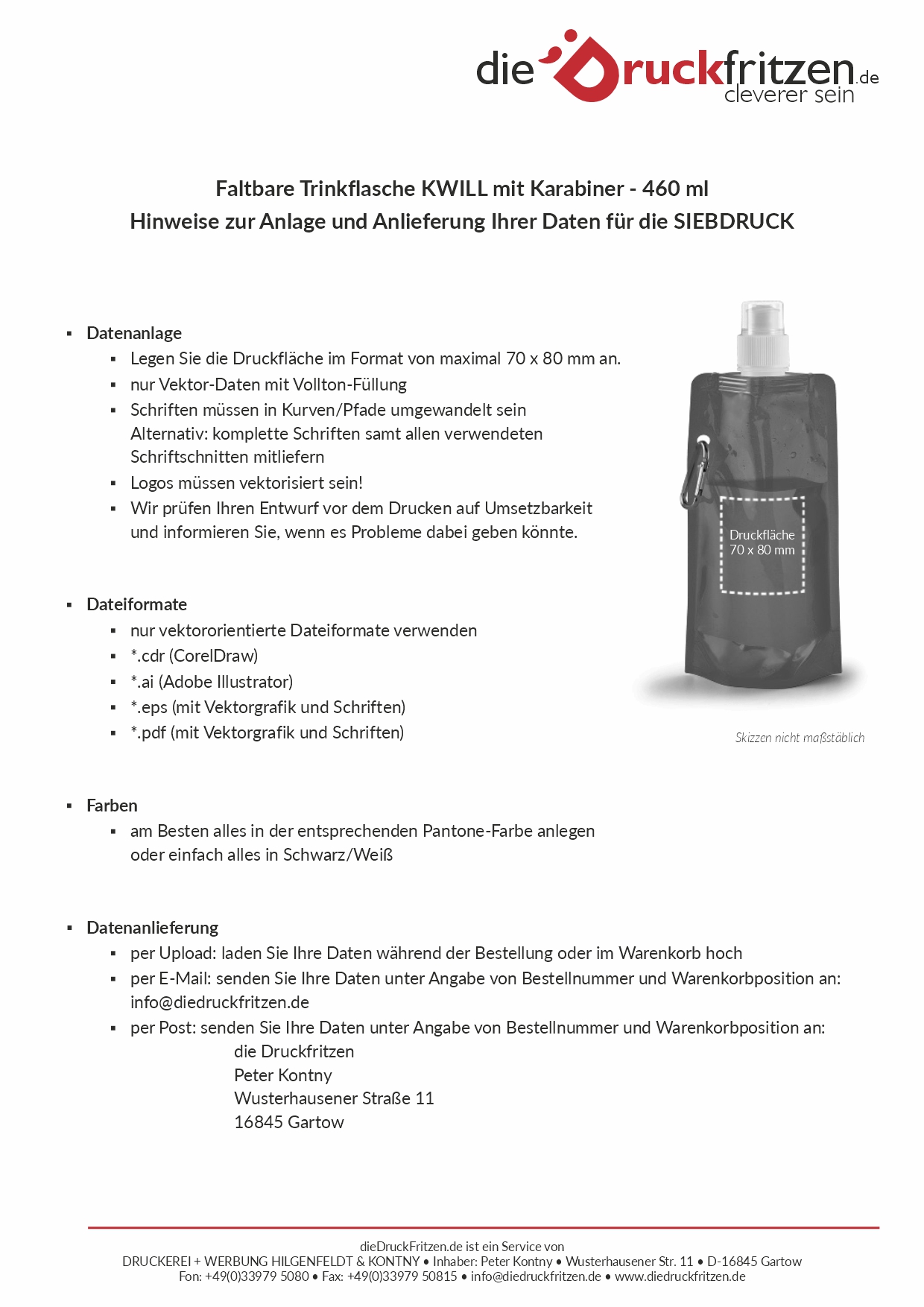 Diese faltbare Trinkflasche besteht aus PE (Polyethylen) und besitzt einen Karabinerhaken. Sie kommt überall dort zum Einsatz, wo die Trinkflasche platzsparend und leicht sein soll, z.B. Sport, Wandern, Radfahren usw. Das Fassungsvermögen beträgt 430 ml. Die Flasche ist ausgestattet mit einem Push-Pull-Trinksystem und außerdem mit einem Deckel. Die Trinkflasche wird für Sie, nach Ihren Wünschen, einfarbig im Siebdruck-Verfahren bedruckt.