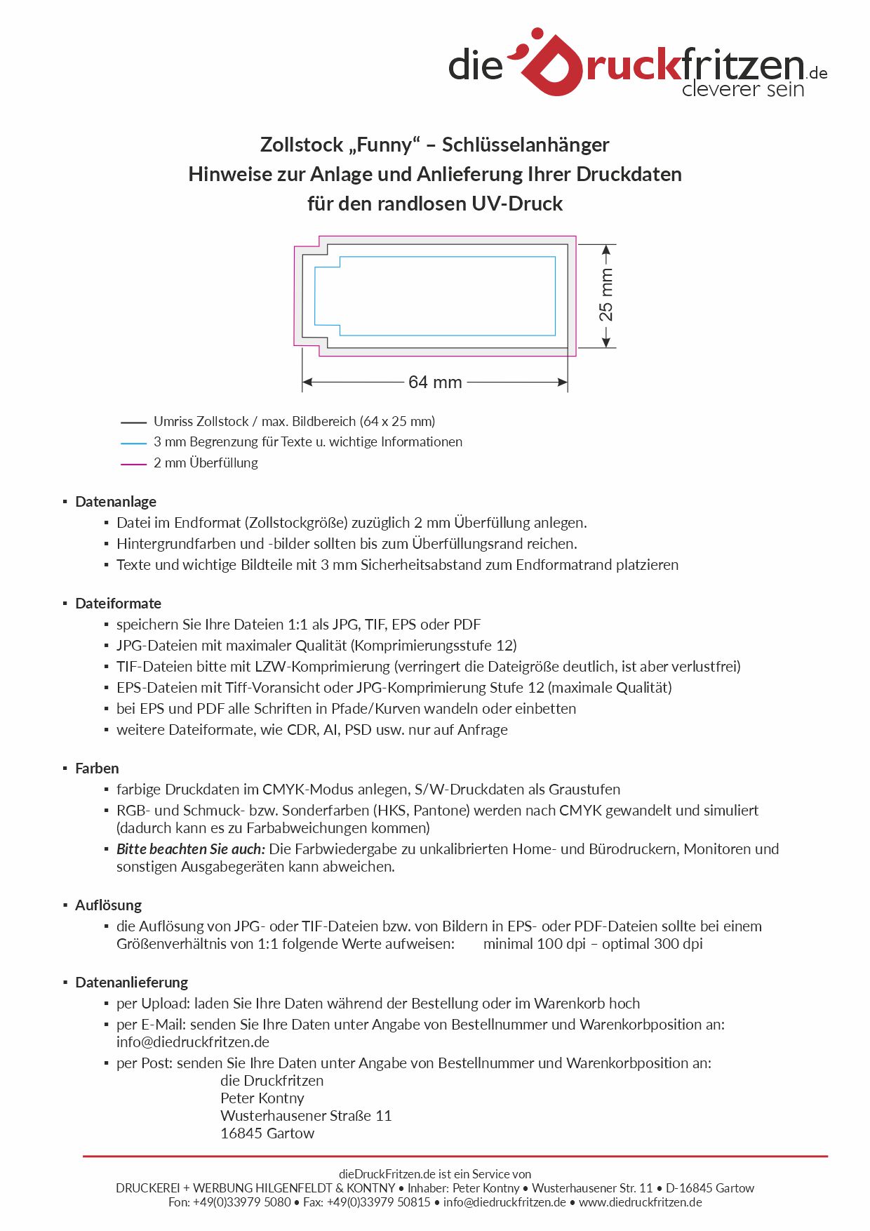 Die Bedruckung von Zollstöcken ist in der Haupsachen für Werbezwecke gedacht. Durch normalen Arbeitseinsatz kann es am Werbeaufdruck zu mehr oder weniger Abrieb oder Verschleiß kommen. Außerdem kann es zwischen den Gliedern, durch den digitalen UV-Direktdruck, zu leichten Sprühnebelspuren des Druckbildes kommen. Das alles stellt keinen Reklamationsgrund dar. Bitte beachten Sie auch die Hinweis unter "Druckdaten".