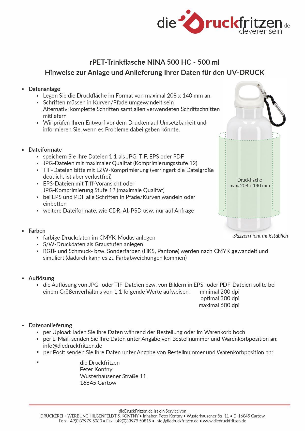 Die Trinkflasche NINA 500 HC besteht aus recyceltem PET, hat eine blickdichte Oberfläche und einen Karabinerhaken am Deckel. Sie ist klassisch schön und in verschiedenen Volltonfarben zu haben. Das Fassungsvermögen beträgt 500 ml. Die Trinkflasche wird für Sie individuell im digitalen UV-Direktdruckverfahren bedruckt.